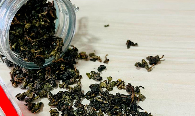 Con su exclusivo proceso consiste en marchitamiento, transpiración, calentamiento y enrollado en forma de perlas, se logra una oxidación parcial que le otorga su particular color.